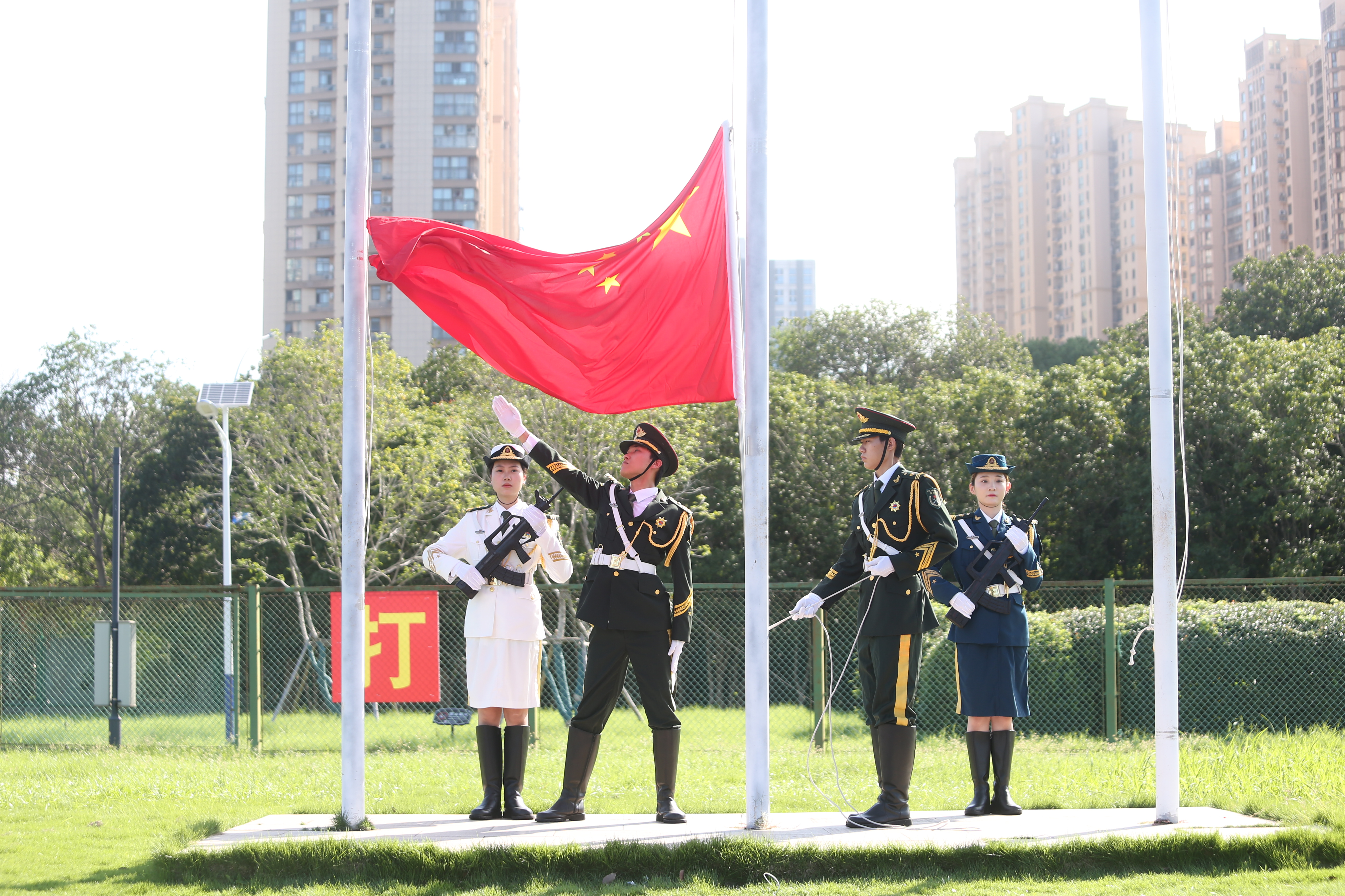 在雄壮的国歌声中,鲜艳的五星红旗冉冉升起,全体人员高唱国歌,向国旗行注目礼。