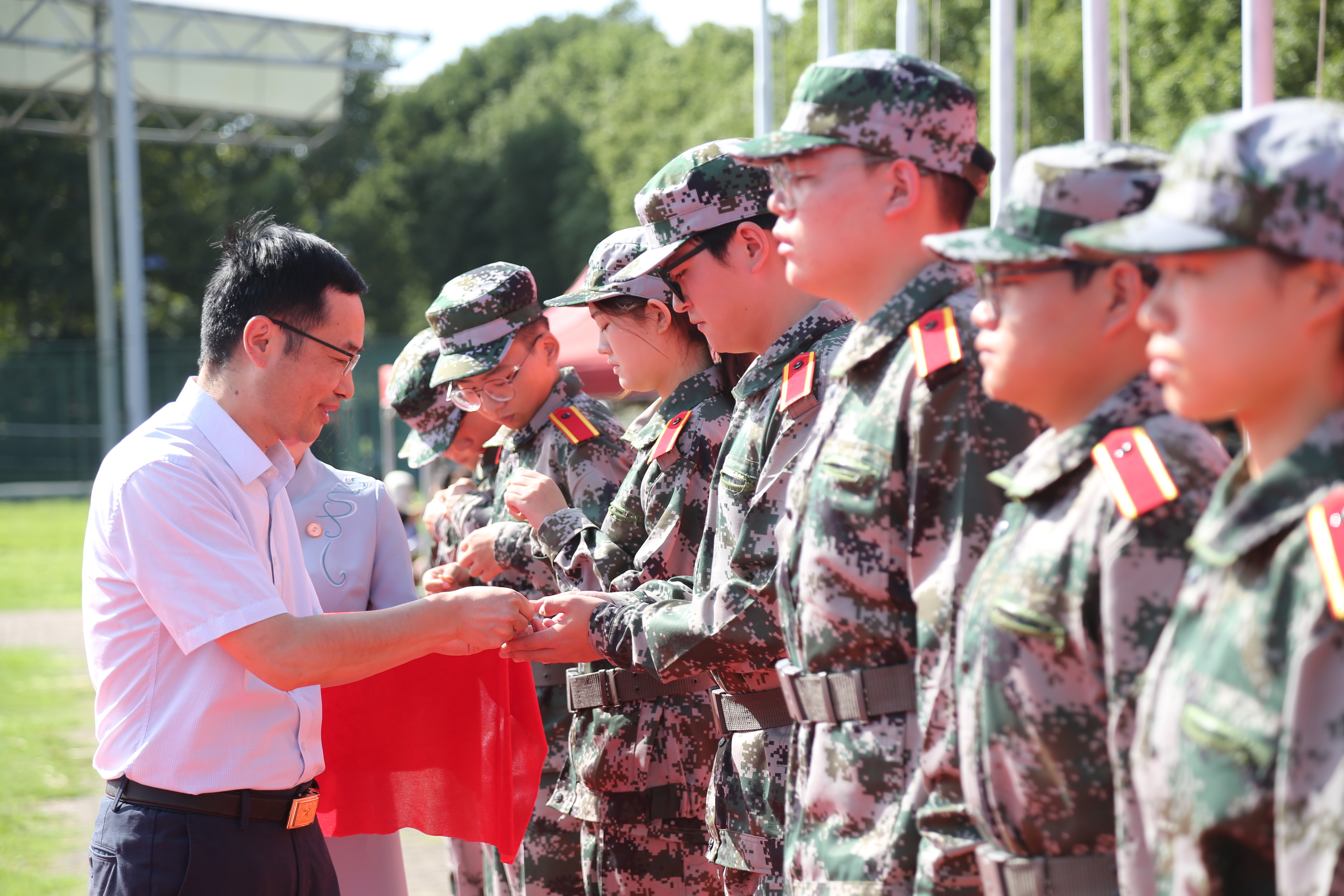 党委副书记、副院长韩美玲向军训团授旗,参训部队领导岳峰接旗。
