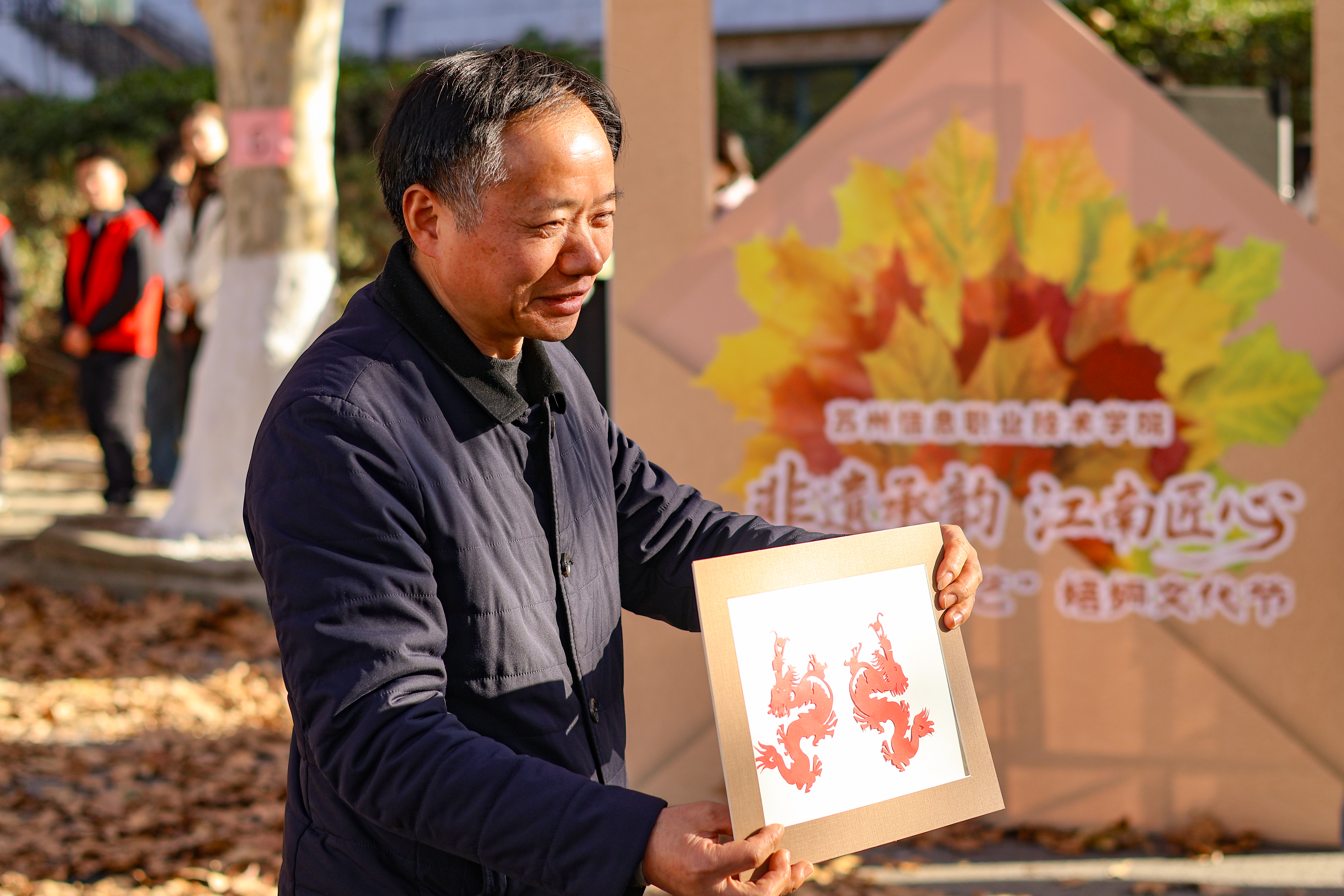 秋意深浓,冬寒微醺,苏信校园仿若一幅斑斓画卷,12月9日,我院举行第三届“六艺”梧桐文化节,以“非遗承韵 江南匠心”为主题,在梧桐大道开启一场与非遗古韵、江南匠心的诗意邂逅。苏州龙泉禧里丝绸科技有限公司创始人黄秋停、同里剪纸非遗传承人计建明受邀出席,学院领导,中层干部,学工、 团委条线教职工,在校师生代表参加。