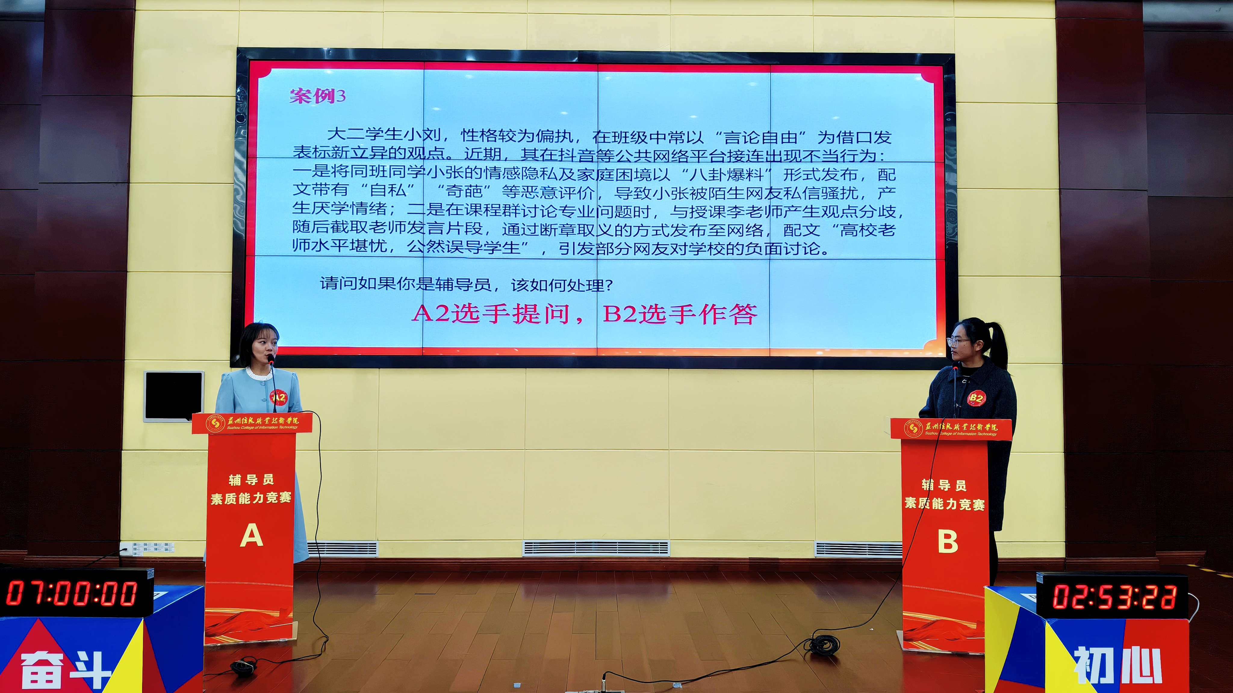 “案例研讨”环节采用“AB角问答”的形式,两名辅导员先后围绕两个复杂案例,通过“你问我答、相互追问”的方式进行交互式研讨。双方共同辨析问题本质、探讨育人规律、提出解决方案,精彩展现了辅导员的理论应用能力、逻辑思维与协同应变水平。