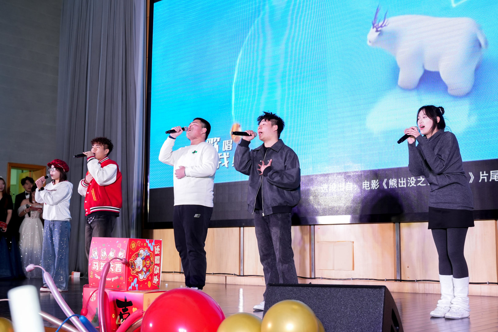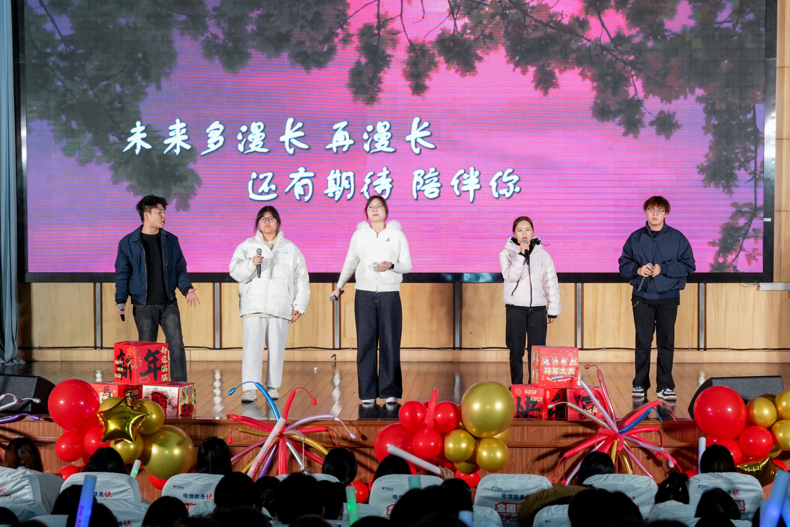 袁旭甫、朱红、邓善欣、韩军昆老师带来歌曲《开始懂了》,赢得全场阵阵欢呼,师生情谊在歌声中流淌;洪依倩、陈奕轩等同学合唱《陪你度过漫长岁月》,用温柔旋律诉说陪伴的温暖。晚会最后,袁梦、徐浩博等同学的大合唱《再次与你同行》,将情谊延续、征程启航的美好寓意融入歌声,为晚会画上圆满句点。