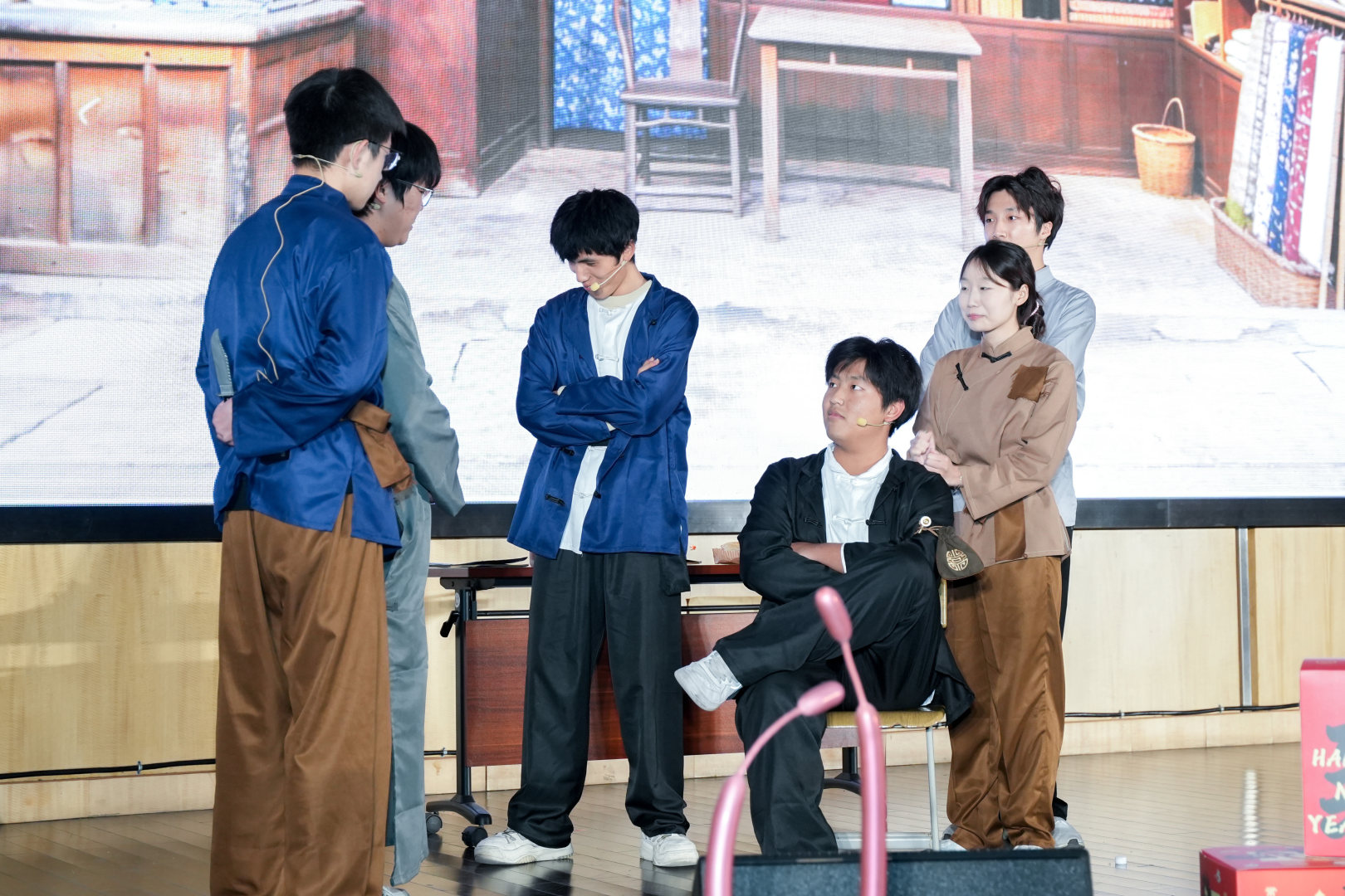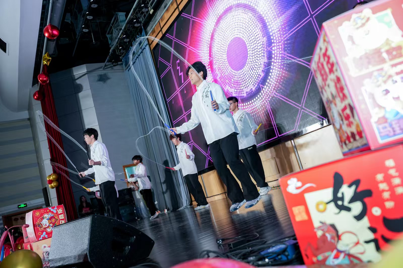 傅涵哲、徐李翔等同学带来民乐演奏,丝竹声声奏响千年风雅,让现场观众沉浸式感受传统文化的底蕴;于雪成、张蕊等同学表演的舞台剧《同心商店》则以地下党员的秘密情报战为背景,演绎出家国情怀与信仰力量,情节扣人心弦;成子航、韩朝政等同学的花样跳绳表演,彩绳翻飞、步伐灵动,让现场观众惊叹不已。